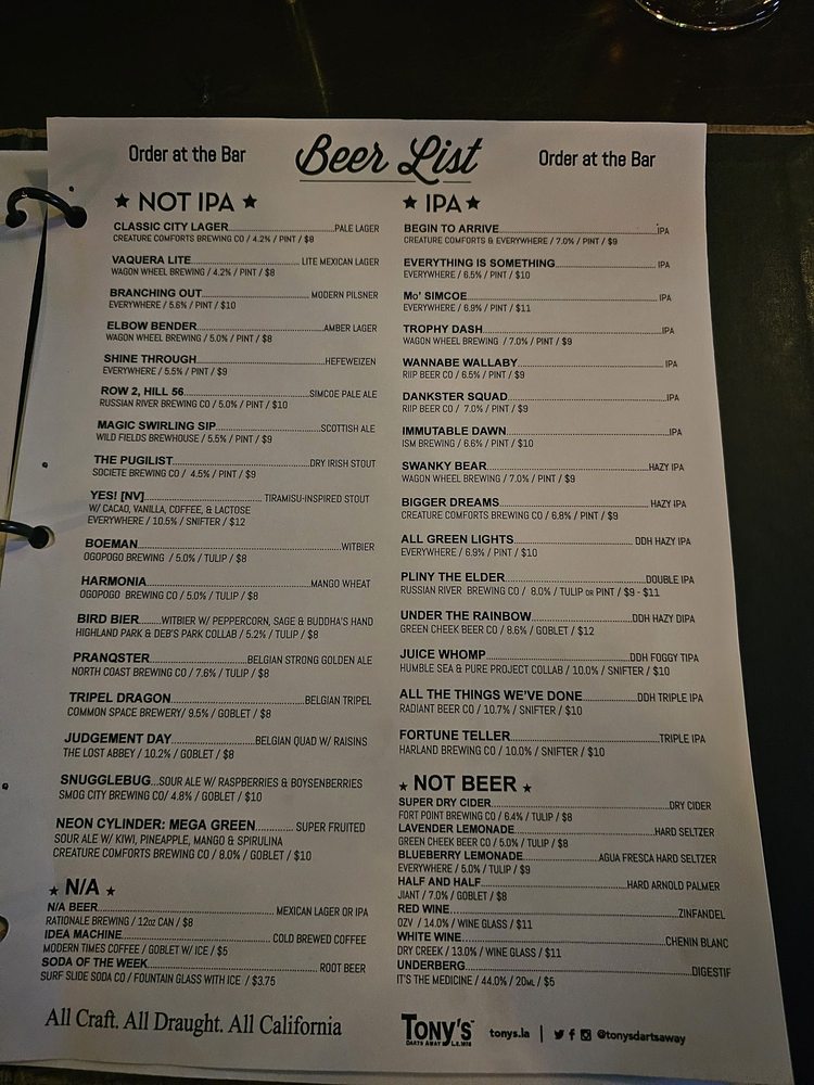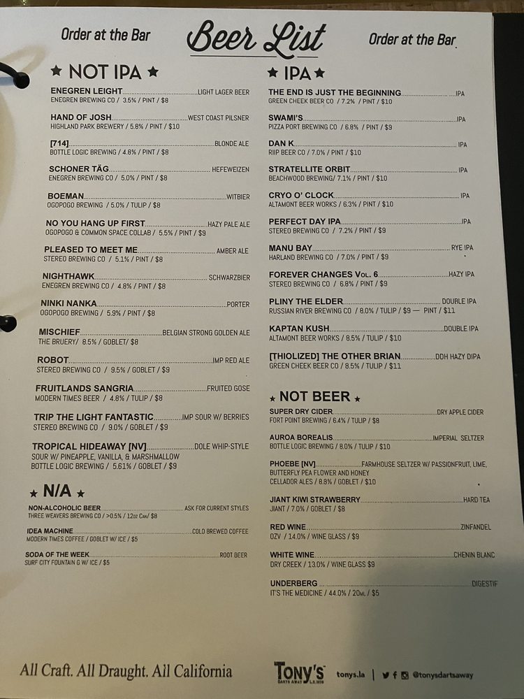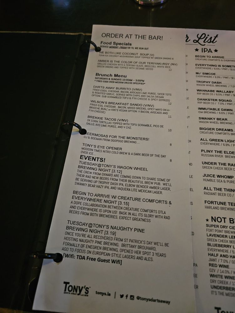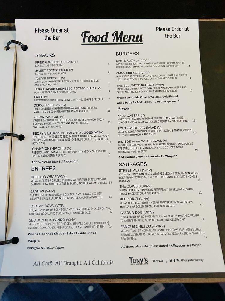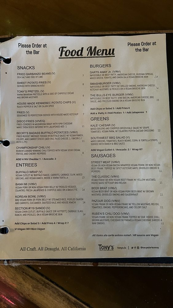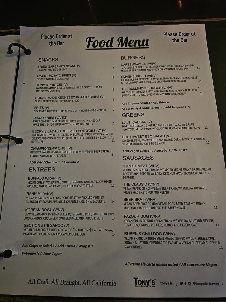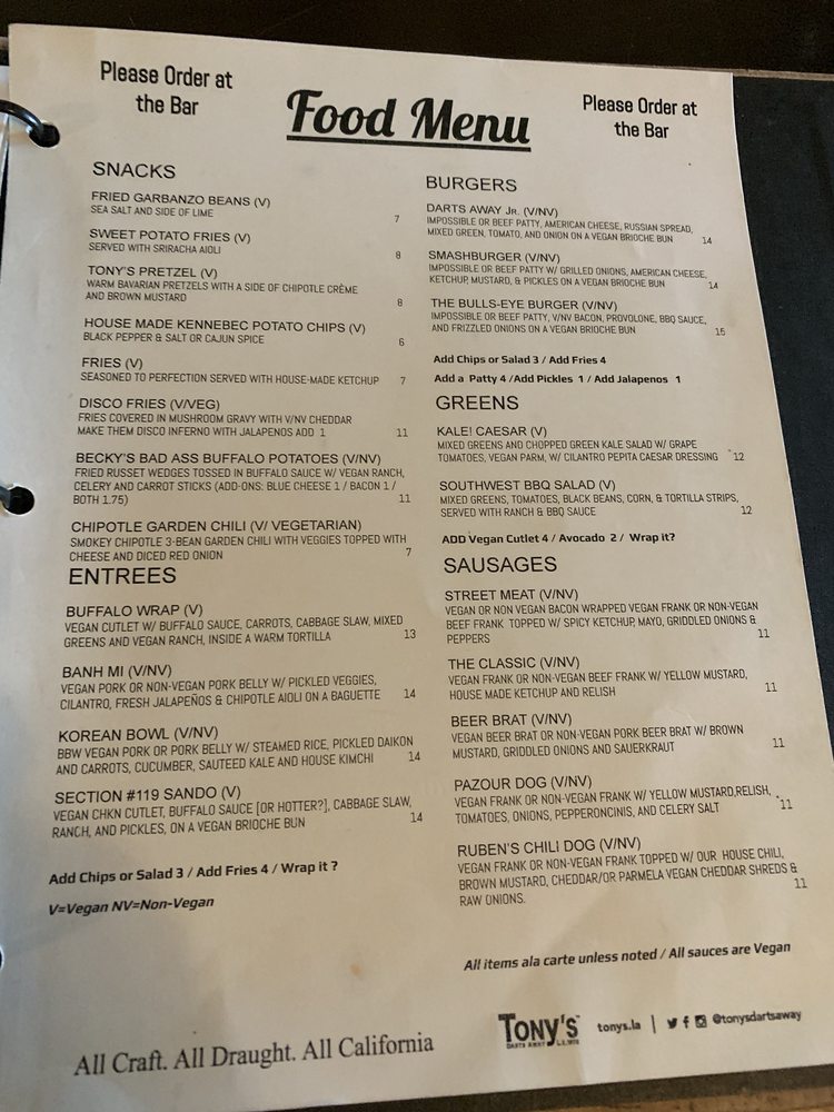 Tonys Darts Away Menu (Update 2025)