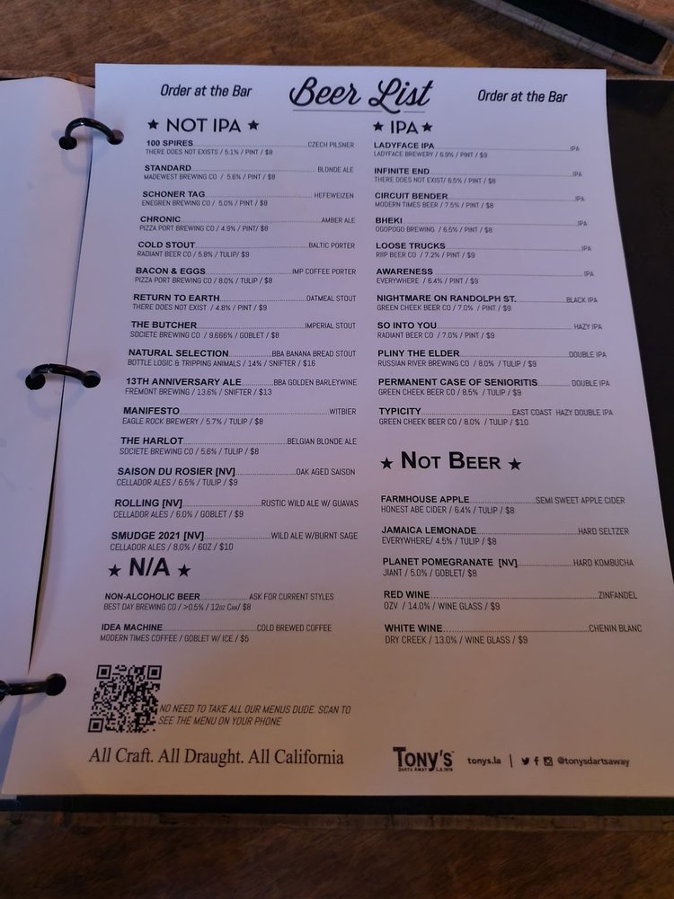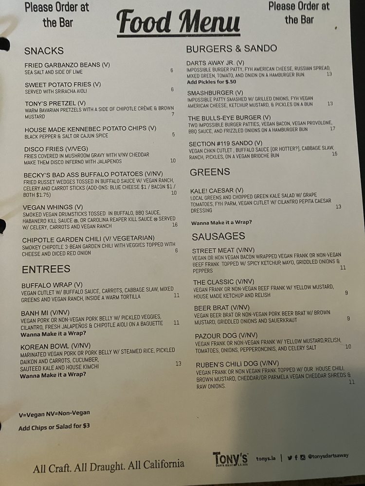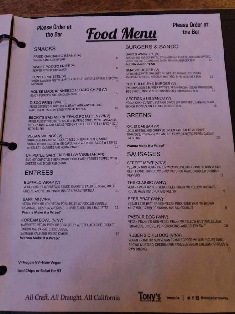 Tonys Darts Away in Burbank, CA is a must-visit gastropub offering a diverse menu with vegan and vegetarian options. Known for its street meat, vegan brats, and gourmet hot dogs, this establishment prides itself on serving delicious food alongside a selection of craft beers and ales. With a relaxed and unpretentious atmosphere, Tonys Darts Away is a favorite spot for locals and visitors alike. Customers rave about the friendly service, excellent vibe, and unique dishes like the Disco Fries and chili. Whether you're looking to watch a game, socialize with friends, or simply enjoy a good meal, Tonys Darts Away has something for everyone. Don't miss out on this gem in the Los Angeles gastropub scene.